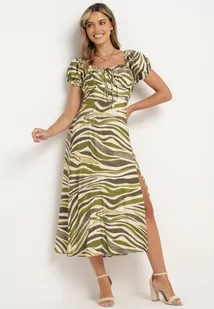 Ciemnozielona Rozkloszowana Sukienka z Wiskozą i Bawełną Wykończona Gumką na Plecach Dimillia