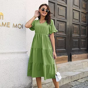 Clotth Damska sukienka Falbala z krótkim rękawem, dekolt w serek, warstwowa, duża spódnica swingowa, szyfonowa, letnia sukienka, zielony (Grass Green-XL), XL