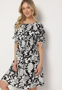 Czarna Bawełniana Sukienka w Ornamentalne Rośliny z Wiązaniem Przy Rękawach Tosvena