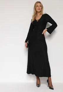 Czarna Brokatowa Sukienka w Zebrę o Rozkloszowanym Kroju z Długim Rękawem Mevenna