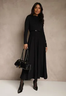 Czarna Dzianinowa Sukienka Rozkloszowana Longsleeve z Wiskozą i Paskiem Tusnira