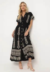 Czarna Haftowana Taliowana Sukienka z Bawełną Zdobiona Srebrną Nicią i Gumkami Ellofia