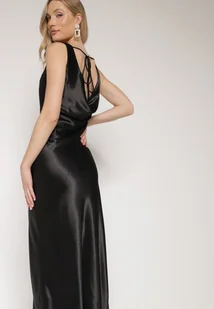 Czarna Koktajlowa Sukienka Satynowa z Wiskozy z Bawełną Delinavia