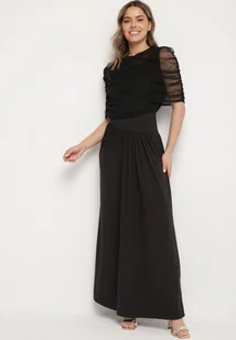 Czarna Koktajlowa Sukienka Zdobiona Marszczeniem z Siateczkową Narzutką Millanea