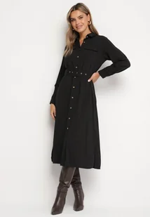 Czarna Koszulowa Sukienka Rozkloszowana Ozdobiona Kieszeniami z Klapami i Paskiem Rinnella