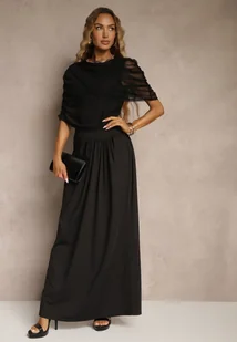 Czarna Marszczona Sukienka o Taliowanym Kroju z Dodatkową Narzutką z Siateczki Milarielis