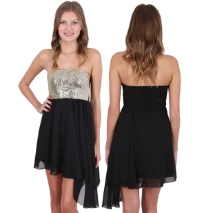 Czarna, asymetryczna sukienka z elastyczną gorsetową górą, z przodu zdobiona złotymi cekinami. Prosty dekolt bez ramiączek wspaniale podkreśla ramiona i oboj...