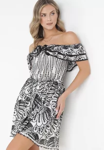 Czarna Rozkloszowana Sukienka Mini Hiszpanka z Gumką w Pasie i Ozdobnym Haftem Lenia
