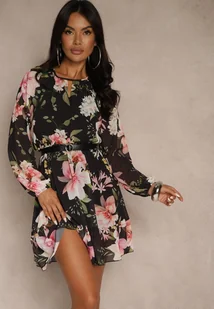 Czarna Rozkloszowana Sukienka Ozdobiona Kwiatowym Wzorem Zerovia