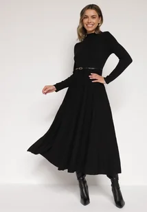 Czarna Rozkloszowana Sukienka z Dzianiny z Wiskozą z Długim Rękawem i Paskiem Tusmina