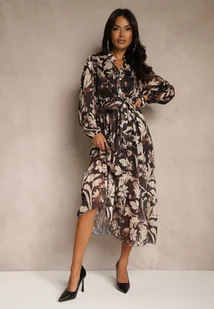 Czarna Sukienka o Rozkloszowanym Kroju z Wiązanym Paskiem i Metaliczną Nicią Nalimirae