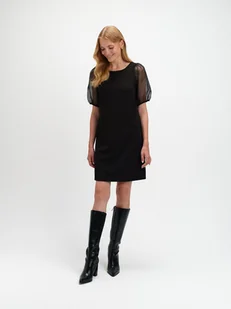 Elegancka czarna sukienka z efektownymi rękawami to idealna propozycja na wyjątkowe okazje. Wykonana z wysokiej jakości materiałów, zapewnia komfort noszenia i doskonałe dopasowanie do sylwetki. Sukienka wyróżnia się subtelnymi, transparentnymi rękawami, które dodają całości lekkości i szyku. To stylowa i ponadczasowa kreacja, która sprawdzi się w wielu stylizacjach.