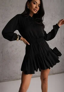 Czarna Sukienka z Wiskozą o Rozkloszowanym Kroju z Falbankami i Wiązaniem Meriianes