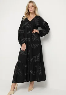 Czarna Wiskozowa Sukienka Rozkloszowana z Metalicznymi Haftami Fennala