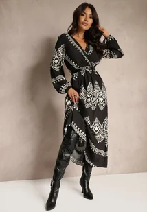 Czarna Wzorzysta Sukienka z Wiskozą o Kopertowym Kroju z Paskiem i Gumką w Talii Sagilaine