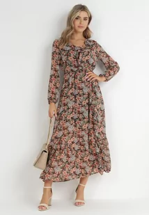 Czarno-Beżowa Sukienka Rozkloszowana w Kwiaty z Gumką w Pasie Veprime