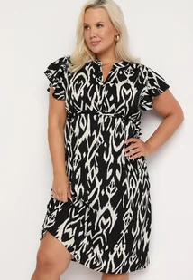Czarno-Biała Rozkloszowana Sukienka z Krótkim Rękawem Zwężana w Talii Ezeviana