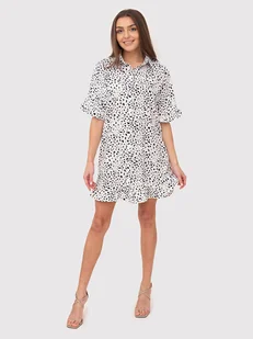 Czarno biała sukienka koszulowa z falbanką na dole DA1743 BLACK/WHITE Biała sukienka koszulowa z kołnierzykiem w zwierzęcy wzór. Zapinana na złote guziki, krótki rękaw, ozdobne falbanki. Materiał wykonania ...