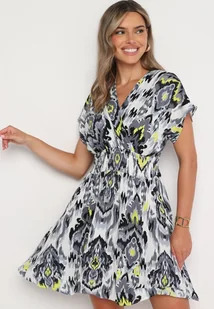 Czarno-Biała Sukienka Rozkloszowana z Kopertowym Dekoltem i Gumką w Pasie Emrra