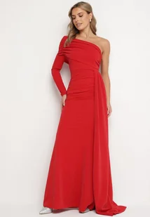 Czerwona Asymetryczna Sukienka Koktajlowa Ozdobiona Metaliczną Nicią i Trenem Emarielin