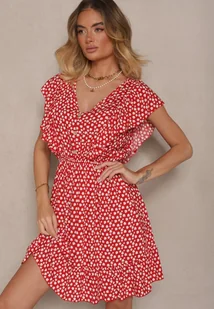 Czerwona Bawełniana Sukienka o Rozkloszowanym Kroju z Guzikami w Kwiatowy Wzór Roniva