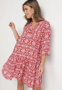 Czerwona Bawełniana Sukienka Rozkloszowana z Falbanką w Ornamentalny Wzór Laneloren