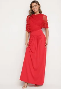 Czerwona Koktajlowa Sukienka Zdobiona Marszczeniem z Siateczkową Narzutką Millanea