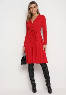 Czerwona Midi Sukienka z Plisowanym Dołem i Kopertowym Dekoltem z Materiałowym Paskiem Obebba