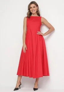 Czerwona Sukienka Bawełniana o Rozkloszowanym Fasonie z Dekoltem Łódką i Kieszeniami Elenira