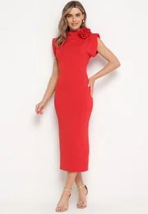 Czerwona Sukienka Midi Dopasowana z Ozdobną Broszką w Kształcie Kwiatka Agnolia