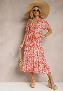 Czerwono-Beżowa Sukienka Letnia z Gumką w Talii i Ozdobnymi Chwostami Aleriana