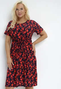Czerwono-Granatowa Sukienka Midi w Kwiaty z Materiałowymi Paskami i Krótkimi Rękawami Sealiva