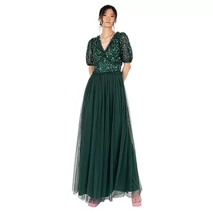 Damska sukienka maxi z dekoltem w serek, z krótkim rękawem, z wybitym tiulem, dla gości weselnych, dla panny młodej, szmaragdowej zieleni, 36, szmaragdowy (Emerald Green), 36