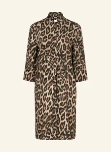 Krój w kształcie delikatnie podkreślonej litery A. Stójka z dekoltem w serek. Zapięcie za pomocą krótkiej, krytej listwy guzikowej. Szeroki karczek. Marszczenie na plecach. Skrócone rękawy. Szerokie mankiety z trzema guzikami. Krótkie boczne rozcięcia. Przedłużony tył. Wykończenie bez podszewki. Zwierzęcy nadruk. Elastyczny materiał