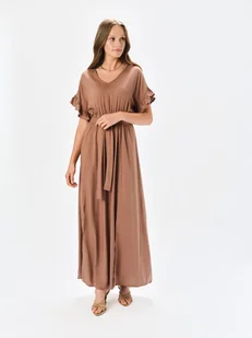 Długa jasnobrązowa sukienka to kwintesencja elegancji i swobody. Wykonana z lekkiego, zwiewnego materiału, doskonale sprawdzi się zarówno na co dzień, jak i na wyjątkowe okazje. Posiada luźny krój z delikatnym marszczeniem w talii, które można regulować za pomocą wiązanego paska, podkreślając sylwetkę. Krótkie rękawy zakończone falbanką dodają jej uroku i kobiecości. Sukienka ma klasyczny dekolt w kształcie litery V, który subtelnie eksponuje szyję. Jej uniwersalny kolor sprawia, że łatwo zestawić ją z różnymi dodatkami, tworząc niepowtarzalne stylizacje. Idealna na letnie spacery, garden party czy romantyczną kolację.