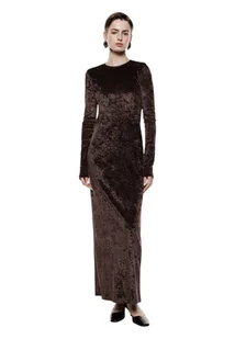 Abito lungo dal taglio affusolato, arricchito da un delicato motivo a micro-puntini e schiena scoperta con discreta chiusura a bottone. Le maniche lunghe e il girocollo enfatizzano un’estetica essenziale e sofisticata, ideale per chi ricerca una silhouette distintiva nel guardaroba contemporaneo. Composizione : 100% Poliestere
