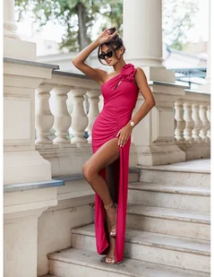 Dopasowana maxi sukienka na jedno ramię PEARLY - fuksjowa Dopasowana sukienka Pearly to elegancka propozycja, która z pewnością przyciągnie uwagę podczas każdej wyjątkowej okazji. Sukienka posiada asymetryczny krój z jednym ramiączkiem, ozdobionym efektowną kwiatową aplikacją, co dodaje jej romantycznego charakteru. Dopasowana góra delikatnie przechodzi w drapowany dół, który zmysłowo eksponuje nogi dzięki wysokiemu rozcięciu na boku. Sukienka jest długa, co nadaje jej elegancji i sprawia, że jest idealnym wyborem na wieczorne wyjścia, uroczyste kolacje czy formalne przyjęcia. Delikatnie elastyczny, lejący materiał idealnie podkreśli atuty sylwetki przy każdym wykonywanym ruchu.