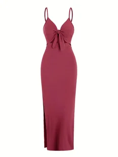 CECHY PRODUKTU: Sukienka maxi Na ramiączkach Wycięcie na plecach Rozcięcie na nogę Elastyczny materiał Ozdobne wiązanie na dekolcie