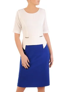 Zaskocz wszystkich tą białą sukienką z chabrową spódnicą, która łączy w sobie prostotę z elegancją. Wzór imitujący żakiet, ozdobiony delikatnymi łańcuszkami, dodaje klasyki i wyrafinowanego stylu. Prosty fason tej sukienki, uszytej z komfortowej dzianiny, podkreśla sylwetkę, zapewniając jednocześnie swobodę ruchów. Krótkie rękawy sprawiają, że jest to idealny wybór na wiosenno-letnie dni. Czy to do pracy, czy na uroczyste okazje, ta sukienka jest doskonałą bazą do tworzenia różnorodnych zestawień, pozwalając na wyrażenie osobistego stylu z subtelną nutą szyku.