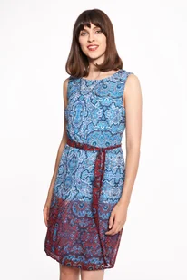 Kolory na tej sukience nie przechodzą w siebie w oczywisty sposób. Czerwona, głęboka barwa wypełnia przestrzenie między kształtami, tworzącymi niebieski wzór na sukience. Ale widać ją tylko na dole sukienki - dzięki temu nabiera ona dwukolorowego, ładnego wyglądu. Dwukolorowa sukienka z wiązaniem nie ma rękawków, a jej ramiączka są szerokie i wygodne. Półokrągły dekolt jest płytko wycięty, ładnie modeluje kształt piersi.
