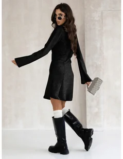 Dzianinowa sukienka mini MYRCELLA - czarna Odkryj urok dzianinowej sukienki MYRCELLA z trapezowym dołem, która łączy w sobie elegancję z niezrównaną wygodą. Doskonała na chłodniejsze dni, wyróżnia się minimalistycznym designem i subtelnymi detalami, które dodają jej charakteru. Trapezowykobiecy krój, który świetnie podkreśla sylwetkę i nadaje lekkości stylizacji. Rozszerzane rękawy modny detal, który dodaje elegancji i oryginalności. Delikatne przeszycia subtelne linie podkreślające krój sukienki, nadając jej wyrazistości.