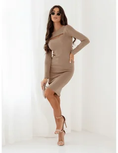 Dzianinowa sukienka z wycięciem PRISI - cappuccino mocca Podkreśl swoją sylwetkę w niezwykle kobiecej i stylowej dopasowanej sukience, która łączy komfort z modnym akcentem. Wykonana z przyjemnej w dotyku dzianiny, doskonale dopasowuje się do ciała, subtelnie eksponując atuty figury. Oryginalne wycięcie na dekolcie dodaje jej wyjątkowego charakteru, przyciągając spojrzenia i dodając nuty zmysłowości. Klasyczny fason z długim rękawem sprawia, że to idealna propozycja zarówno na chłodniejsze dni, jak i wieczorne wyjścia. Uniwersalny, beżowy kolor świetnie komponuje się z dodatkami w odcieniach beżu, złota i czerni.