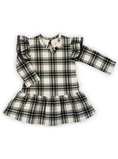 Wyprodukowano w Polsce Modna sukienka z długim rękawem dla dziewczynki wykonana z bawełny dresowej w kratkę beżowo-czarną. Model zdobi falbanki przy ramionac...