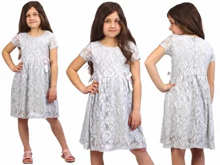 Sukienka marki BREEZE, koronkowa w szarym kolorze z krótkim, koronkowym rękawkiem odcięta powyżej pasa dwuwarstwowa wierzchnia warstwa ozdobna z koronki z kw...