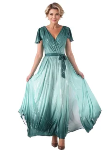 Wprowadź do swojej garderoby powiew świeżości i elegancji z tą zachwycającą zieloną sukienką maxi, utrzymaną w odcieniach butelkowej zieleni i mięty. Subtelny efekt ombre oraz delikatny połysk tkaniny dodają kreacji wyrafinowanego blasku, idealnego na wieczorne wyjścia i wyjątkowe okazje. Kopertowy dekolt w serek pięknie podkreśla linię biustu i szyi, nadając całości kobiecego wdzięku. Rozkloszowany fason w połączeniu z gumką w pasie i dołączonym paskiem świetnie modeluje sylwetkę, zapewniając zarówno elegancki wygląd, jak i pełną swobodę ruchów. Rozcięcie z przodu dodaje nuty zmysłowości i l