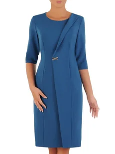 Elegancka lazurowa sukienka midi to must-have w każdej damskiej garderobie. Jej prosty fason w połączeniu z okrągłym dekoltem i 3/4 rękawami tworzy klasyczną, a zarazem stylową całość. Sukienka posiada ozdobną broszkę, która dodaje elegancji i wyjątkowości. Zakładka maskująca brzuch oraz pionowe zaszewki optycznie wyszczuplają sylwetkę, zapewniając idealne dopasowanie. Dzięki użyciu wytrzymałej tkaniny, sukienka jest nie tylko piękna, ale i wygodna.