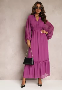 Fioletowa Rozkloszowana Sukienka Maxi ze Stójką i Falbanką Camillene