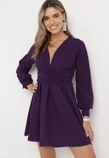 Fioletowa Rozkloszowana Sukienka Mini z Głębokim Dekoltem Ozdobiona Marszczeniem i Guzikami Jerikan