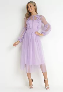 Fioletowa Rozkloszowana Sukienka Tiulową z Koronką Llaudia