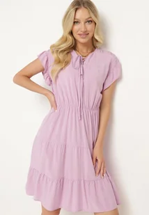 Fioletowa Sukienka z Gumką w Pasie Ozdobiona Falbanką i Wiązana Materiałowym Paskiem Tiamalou